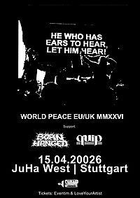 WORLD PEACE brutally chaotic and yet rigorously disciplined, San Francisco's WORLD PEACE have been turning heads with their unique brand of low-end mayhem since the release of their 2020 debut LP “Come and See”. A guitar-less, dual bass attack paired with drumming that can only be described as relentless provide the sonic backdrop for what is arguably the band's most compelling attribute – the Christian mysticism explored in their lyrics. A quick glance at the band's song titles and merchandise displays a distinctive, intentional visual language that sets the band apart from their contemporaries and has undoubtedly contributed towards their success thus far. Fresh off a 100+ show, 4 continent tour supporting their second LP “It is Written”, WORLD PEACE show no signs of slowing down, already hard at work at both a collaborative record as well as their third LP. Past tours alongside bands such as Portrayal of Guilt, Uniform, Nails, and The Body have proven WORLD PEACE to be one of the strongest forces in forward-thinking heavy music today.